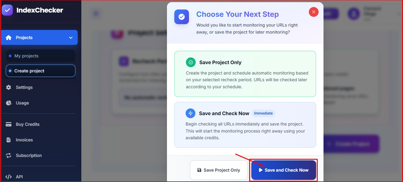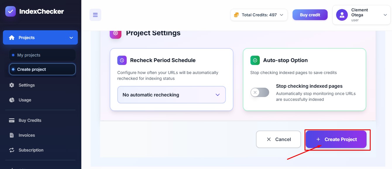 Click on “Create Project” to start your index monitoring project. The tool lets you track your web pages using profession-grade tools.
