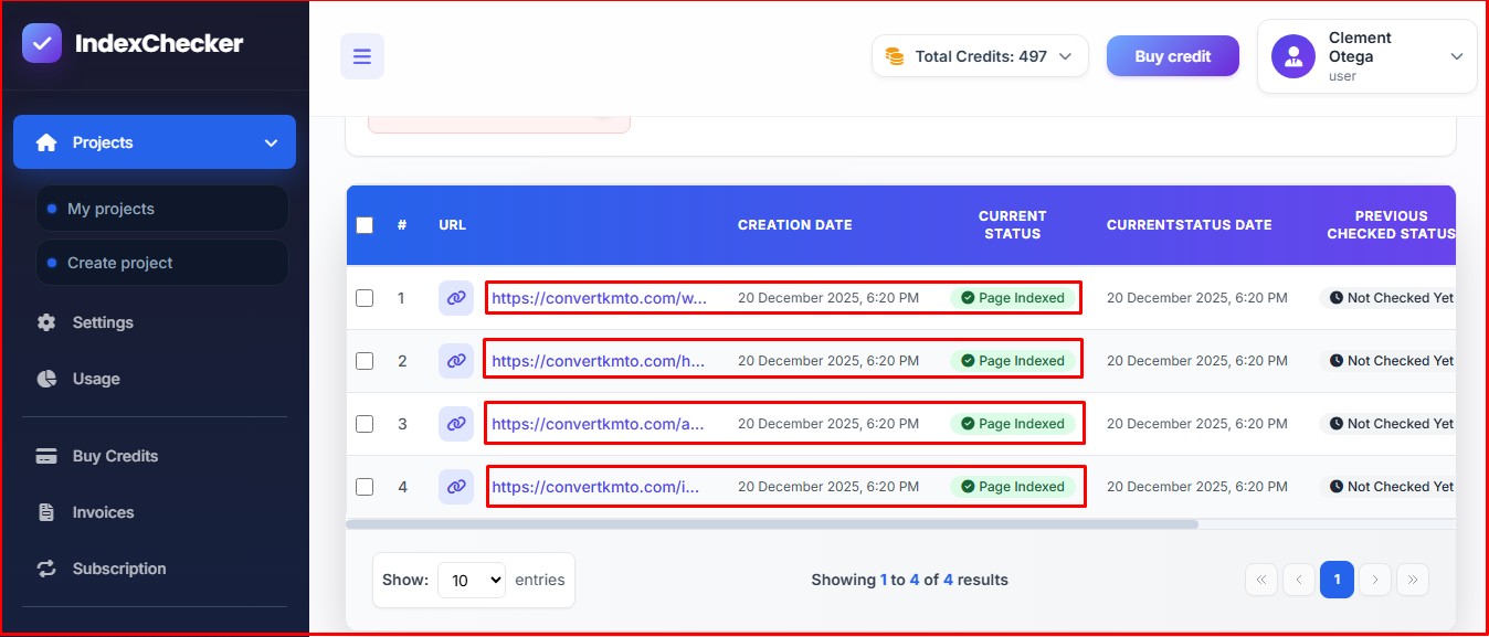 All four URLs checked. You can tell if the pages have been indexed or not from the dashboard. The tool also allows you to monitor each of the pages. That way, you’ll know when Google de-indexes any of the pages and respond quickly.