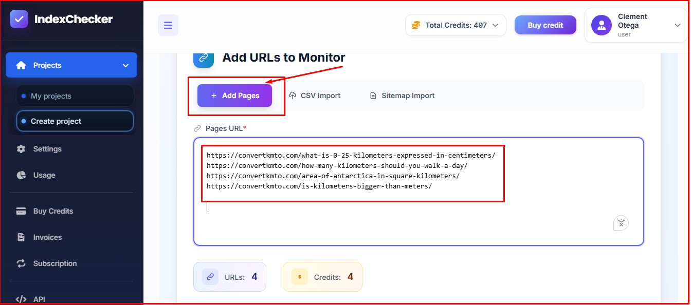 Add the web pages you want to monitor. You can add as much as 2500 URLs on Indexchecker.io and monitor all of them simultaneously.
